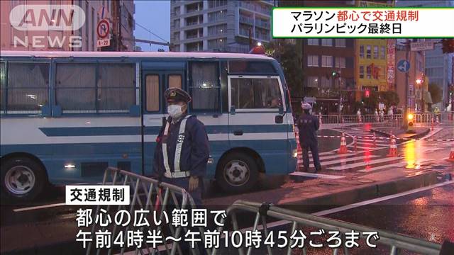 東京2020 パラリンピック 競技大会 マラソン競技に伴う交通規制が都内各地で2021年9月5日日4時30分から10時45分頃まで行われる. パラリンピック最終日の5日マラソン競技の開始時間に合わせて都心では午前4時半から交通規制が始まっています パラリンピックのマラソン.